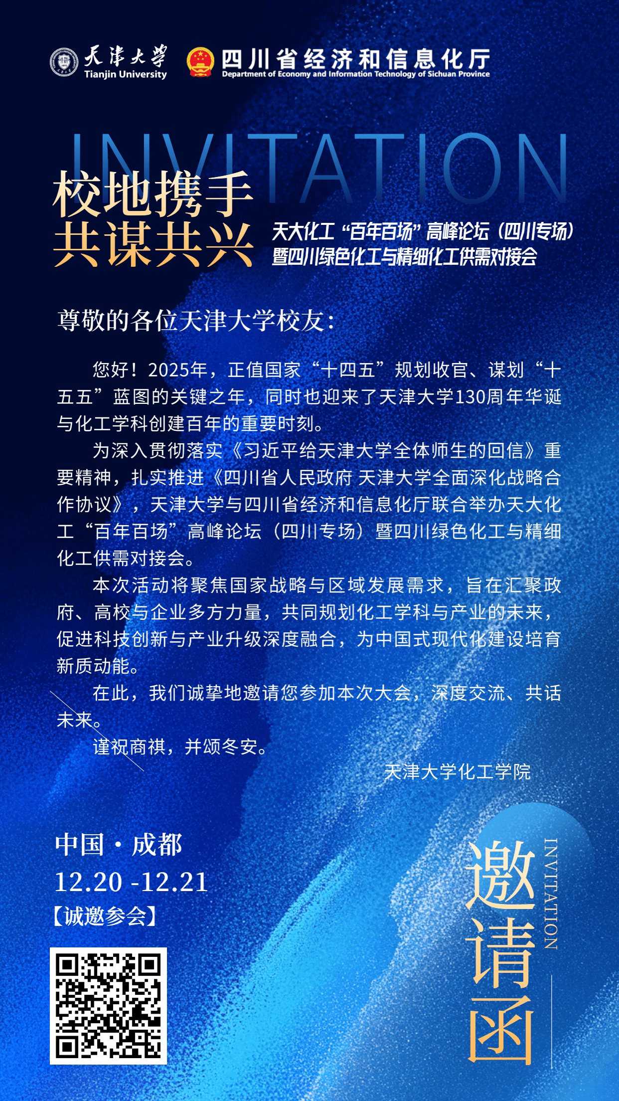 在此,我们诚挚邀请广大天津大学校友,特别是西南地区从事化工行业的校友院友参与本次活动,共绘化工学科与行业发展的美好蓝图。